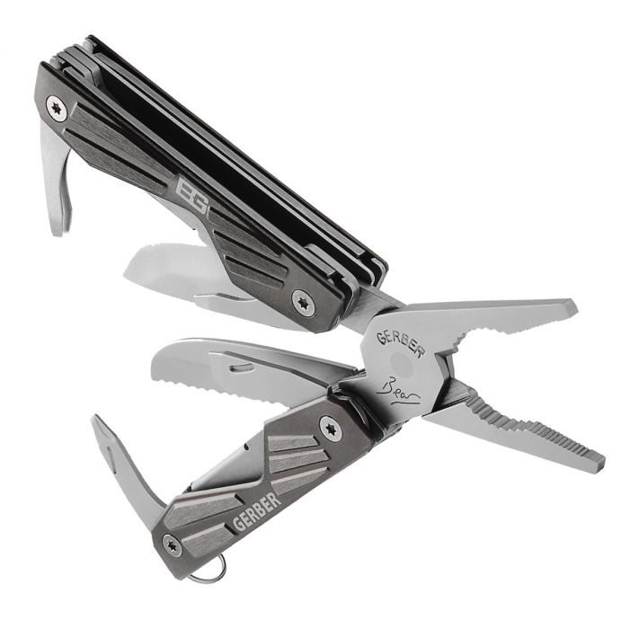 Compact Multitool Gerber Bear Grylls to niewielkie narzędzie ze stali nierdzewnej, które posiada dziesięć narzędzi w tym dwa ostrza (gładkie i ząbkowane).