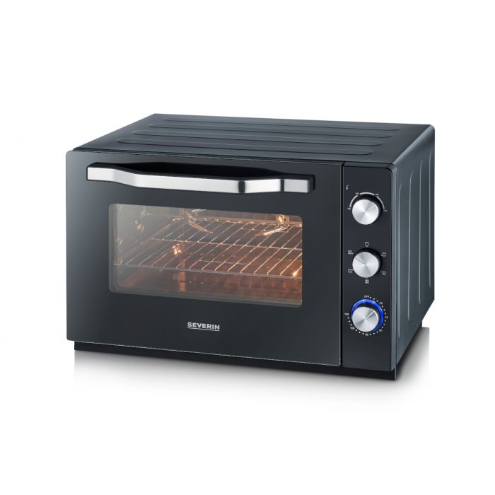 Minipiekarnik Severin TO2073 60l Proste przyrządzanie posiłków Minipiekarnik Severin TO2073 60l z wewnętrznym oświetleniem posiada powierzchnię pieczenia pokrytą powłoką nieprzywierającą ułatwiającą czyszczenie. Przystosowany do pieczenia bardzo dużej pizzy (Æ 30,5 cm) z funkcją ogrzewania od dołu/ od góry. Funkcja grilla z obrotowym rożnem z własnym napędem umożliwia łatwe przygotowanie grillowanych kurczaków. Różne opcje przygotowania potraw - od frytek po ciasta dzięki ogrzewaniu od dołu i/lub od góry, funkcji termoobiegu i dołączonych do zestawu tacek do grillowania i do pieczenia. Łatwy w utrzymaniu czystości Minipiekarnik Severin TO2073 60l posiada obudowę izolowaną termicznie z przednimi szybami ze szkła o wysokiej jakości. Komora grzewcza o pojemności 60 l z wewnętrznym oświetleniem; powierzchnia wewnętrzna pokryta nieprzywierającą powłoką ułatwiającą czyszczenie. Obrotowy rożen zapewniający perfekcyjne grillowanie mięsa i drobiu, łatwy do zdjęcia za pomocą praktycznie wygiętego uchwytu. Szeroki asortyment wyposażenia dodatkowego: piec do pizzy, rożen obrotowy, tacka do pieczenia, ruszt do grilla, tacka na okruchy i 2 uchwyty do wyciągania potraw.
