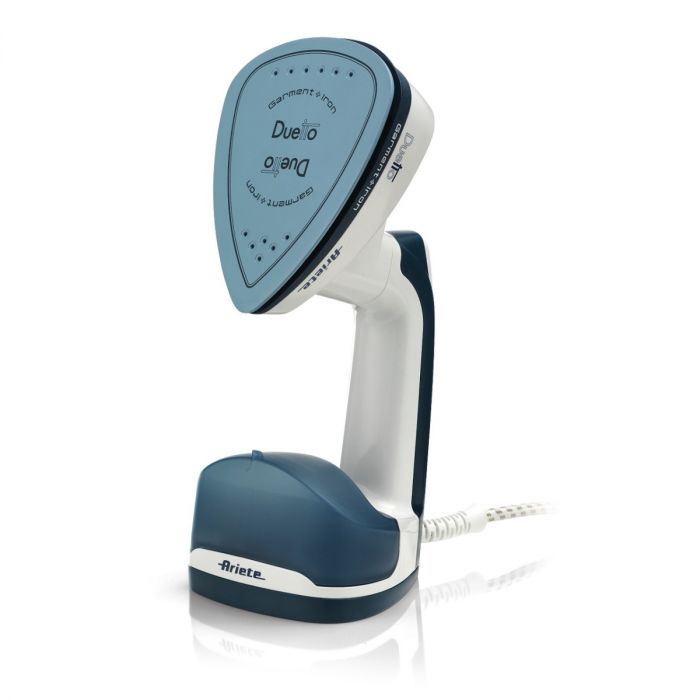 Prezentujemy unikatowe rozwiązanie, które jest kolejnym, wspaniałym patentem należącym do rodziny marki Ariete. Dwie formy prasowania parowego zawarte w jednym, małym i poręcznym urządzeniu o mocy 1000 W. Duetto Garment + Iron jest połączeniem małego i zgrabnego żelazka z mocną i wydajną parownicą. Wyposażone jest w nieprzywierającą, ceramiczną stopę, technologię Ideal Temp, przycisk pary z blokadą bezpieczeństwa. Waży tylko 1 kg, posiada kabel o długości aż 2,5