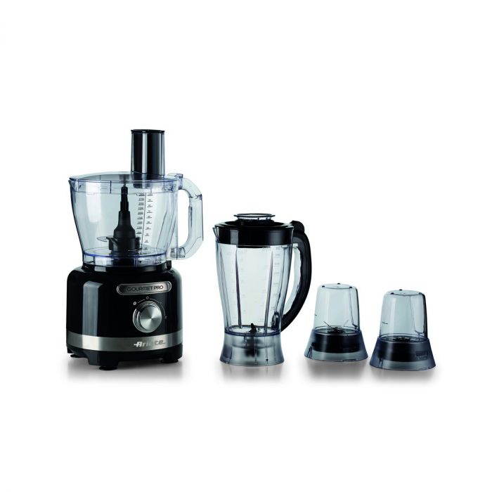 | Akcesoria w zestawie | podwójne ostrze ze stali nierdzewnej, tarcze do ścierania, krojenia w plastry, krojenia frytek, końcówki do wyrabiania, zagniatania, wyciskania soku, popychacz, blender kielichowy z tworzywa o pojemności 2 l |