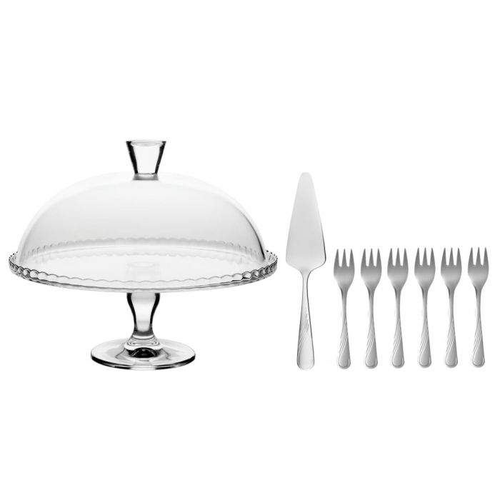 Zestaw do ciasta doskonały do eleganckiego zaserwowania ulubionych słodkości. Komplet składa się ze szklanej patery na nóżce (z kloszem) oraz łopatki i 6 widelczyków do ciasta.