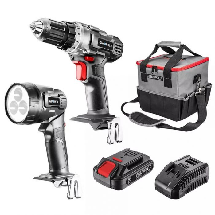 ZESTAW GRAPHITE ENERGY+: WIERTARKO-WKRĘTARKA 18V, LATARKA, TORBA, AKUMULATOR 2.0AH, ŁADOWARKA